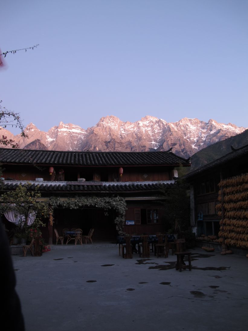 Someone had diverted a waterfall further up the mountain, so the path to our hostel was flooded… he lead us carefully along the sides of the path and we finally arrived at the Naxi Guest House just as the sun was setting.