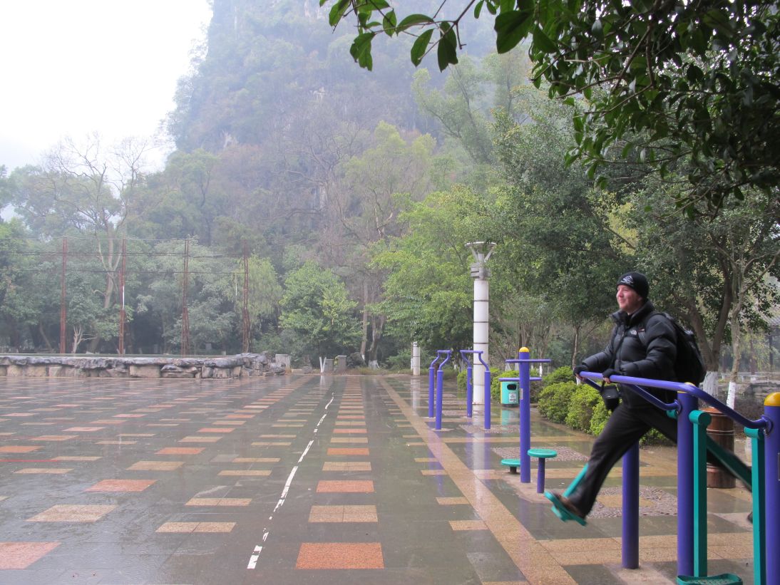 (J – It’s not traditional, but I challenge you to find a better milkshake anywhere on the planet. Anyway here are some pictures of Yangshuo, including me using the public exercise equipment in the main square, which we also saw from the walls in Xi’an, along with Penny’s “It’s 4PM and I need some lunch, enough with the photos” face).
