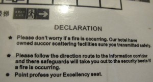 It’s called 9 dragons house and it’s pretty nice, very convenient, but with a mattress that’s as hard as a rock (or if you’re a Gob Bluth fan, “solid as Iraq”). The only worrying thing about the hostel was the warning I found on the back of the door to our room. I felt totally safe and wasn’t worried about dying in a fire UNTIL I read this sign… bonus points for anyone who knows what an excellency seat is.