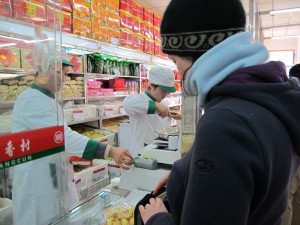 When they dug the moat for the Forbbiden city, they used the dirt to make Jinshang park, which is basically a big hill with a pagoda on top. We climbed up and got some amazing views of the Forbbiden city, then climbed all the way down again and tried to walk back to the subway. We basically got lost and ended up wandering through the backstreets and alleys of Beijing (which are called Hutong) for an hour or so, before finally finding a subway stop and heading back to the hostel with blistering feet. On the way back we stopped at a local bakery and Penny did some snack food shopping for our Great Wall hike tomorrow. Hardly anything here is written in English, and when it is, it’s just the chinese, in English… so it says “Xin Bao Long” or whatever instead of “bean curd milkshake”… so we end up doing a lot of pointing and hand gestures.